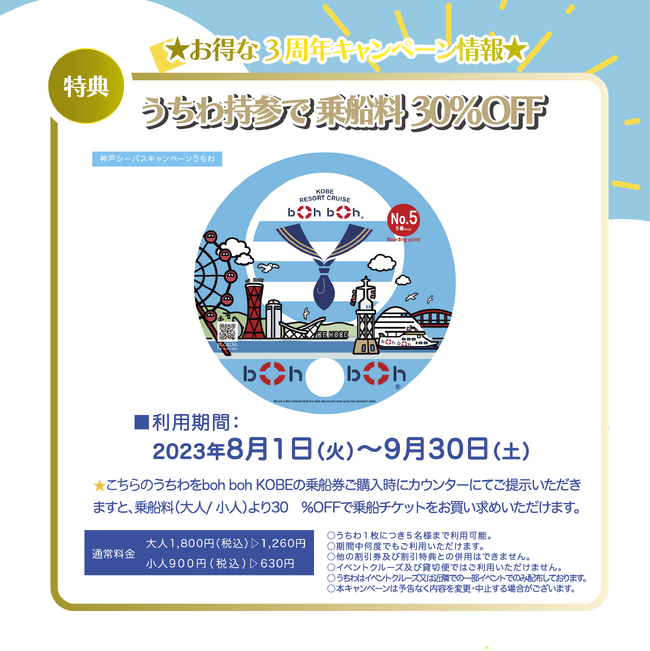 神戸シーバスboh boh KOBEは、9月20日に就航3周年を迎えます。3周年の記念キャンペーンとして【煌めく夏 神戸で楽しめっ!うちわっしょい!~boh boh KOBE 3rd Anniversary~】を開催中です。