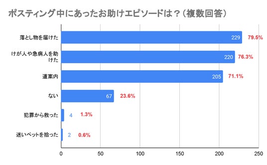 「落とし物を届けた」(79.5%)「けが人や急病人を助けた」(76.3%)と答えたスタッフはそれぞれ約8割。その他「道案内」をしたことがある(71.1%)と、チラシを配布する街で何らかのお助けエピソードを持つスタッフが多くいることがわかりました。「犯罪から救った」(1.3%)「迷いペットを拾った」(0.6%)などの回答もあり、ポスティングの仕事をしながら街の様子に目を配り、地域住人の手助けになっている例が多く見られました。