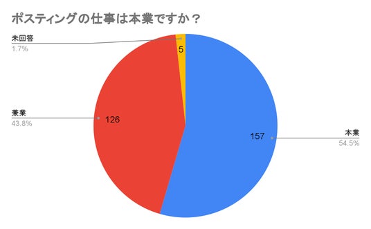 ポスティング枚数や時間を選べる仕事の仕方から、他のアルバイトとの掛け持ちをする人が 多いようです。また正社員として副業する人や空いた時間にスポットで入れる仕事としてミ ュージシャン、俳優などと兼業で働く人が約10%いるとわかりました。