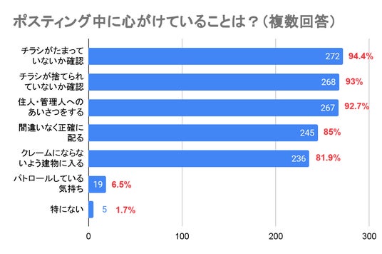 ポストに「チラシがたまっていないかを確認」するスタッフが94.4%おり、防犯面や独居高 齢者等を考慮して配布しているスタッフが多いことがわかりました。また、チラシが捨てられていないか確認する、住人や管理人に挨拶をすることを意識するスタッフが9割を越え、チラシ投函後の状況や住んでいる人へ配慮するスタッフが多いようです。チラシを配布するだけでなく、地域や地域に住む人とコミュニケーションを取りながら正確、且つ丁寧に配布しているスタッフが多いことがわかりました。