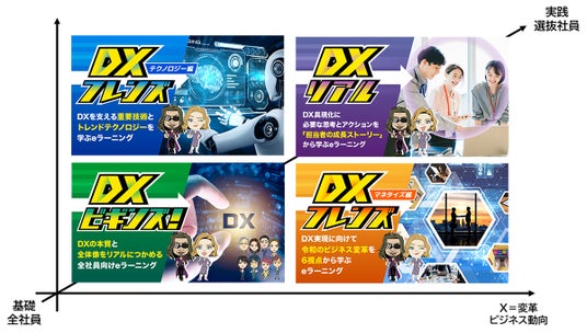 また、本コンテンツは、第21回日本e-Learning大賞で厚生労働大臣賞を受賞したDX人材育成コンテンツの続編です。DXの基礎から本質を学べる「DXビギンズ!」、DXを支える重要技術とビジネスポイントを学ぶ「DXフレンズ(テクノロジー編&マネタイズ編)」、そして今回リリースいたしましたDX推進に必要な知識を身に着ける「DXリアル」との組み合わせで、継続的な学習機会を提供し、社員がDXから脱落することなく全員で参画する組織文化の醸成に貢献します。