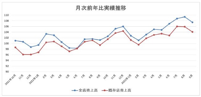 株式会社リテールパートナーズの2023年9月度の月次情報では、既存店売上高は前年同期比4.1%増、客数1.0%増、客単価3.0%増となった。