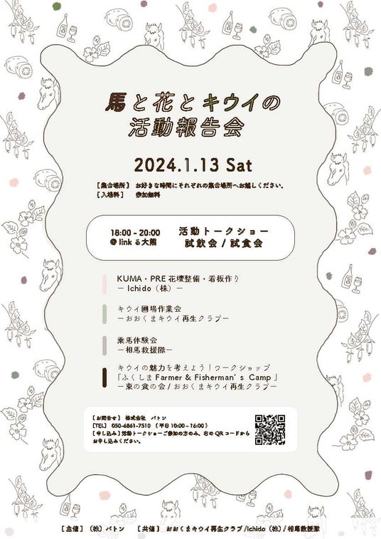 株式会社バトン(神奈川県藤沢市)は、福島県大熊町の関係人口拡大を目指した活動を継続して取り組んでまいりました。このたび、集大成となる「馬と花とキウイの活動報告会」を2024年1月13日(土)に開催いたします。「馬」「花」「キウイ」という大熊町の活動資源を用いた体験会を行うほか、これまでの活動を締めくくる「トークショー」を実施。これまでの活動を報告するとともに、さらなる関係人口の拡大に向けて取り組んでまいります。