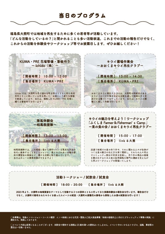 15:00~17:00 ふくしまFarmer & Fisherman s Camp/東の食の会・おおくまキウイ再生クラブ(集合:linkる大熊)