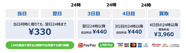 330円(税込)で、レンタル当日から翌日24時までご利用いただけます。(ご返却いただけない場合は自動的に延長・買取料金が課金されます。)