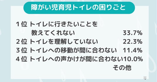 - 障がい児のトイレの困り事で最も多いのは「トイレに行きたいことを教えてくれない」(33.7%)、次いで「トイレを理解していない」(22.3%)