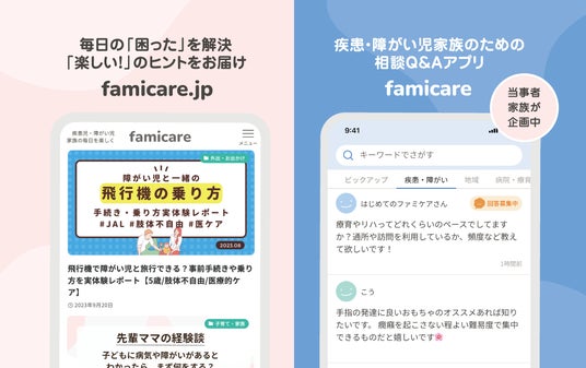 ファミケアは「疾患児・障がい児の毎日を楽しく!」をコンセプトに掲げるサービスブランドです。疾患や障がいのある子どもとその家族が困っている事を解決し、楽しい!と感じる時間を一瞬でも多く生み出す事を目指して誕生しました。情報サイトやアプリの提供、法人向けのプロジェクトやニーズマッチ支援を展開しています。