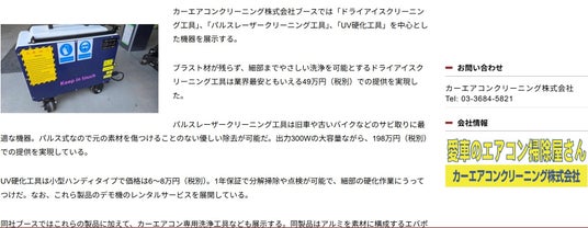 ドライアイスクリーニングやパルスレーザークリーニング、洗車用吸水タオルなど最新のカーディテイリング関連機器などを出品。整備工場や鈑金塗装工場向けに新規ビジネスを提案するプレゼンテーションも行う。