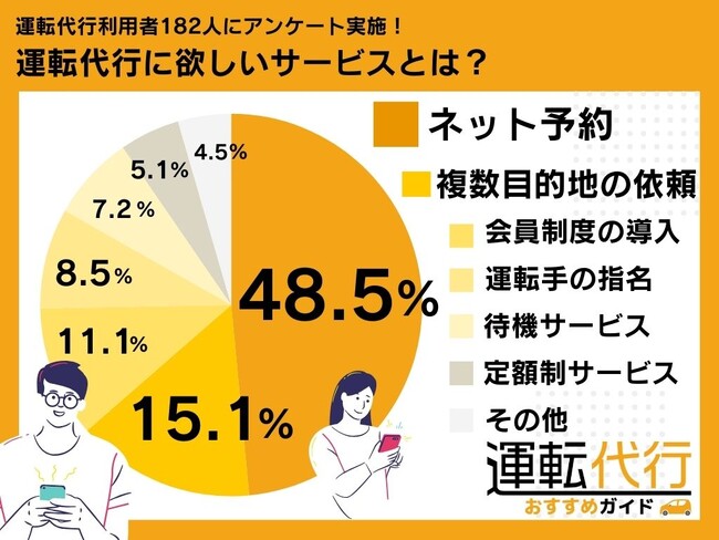 運転代行合同会社(本社:東京都中央区銀座一丁目12番4号、代表取締役:小林尚貴)が運営する運転代行ポータルサイト「運転代行おすすめガイド」は、運転代行利用者182人を対象に、運転代行業者にどのようなオプションサービスを望むかアンケートを実施し、その結果について調査・分析いたしました。