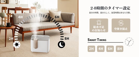 【3段階ミスト量調節&吹出口360°対応&2-8時間のタイマー設定】