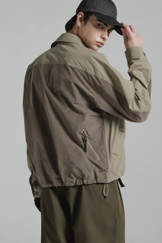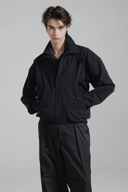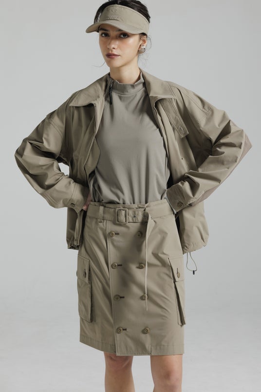 クラシックなスウィングトップを、ゴルフシーンに適した機能性素材でアップデート。ゆったりとしたシルエットながら、衿を立ててストラップを留めたり、裾のドローコードでシルエットを調整したりと、気分やコーディネートに合わせた着こなしが可能です。軽量な2WAYストレッチ素材に加え、軽撥水性を備えているため、突然の天候変化にも対応。持ち運びがしやすく、春夏シーズンのラウンドや移動時の羽織りとしても最適です。同素材のバギーパンツ(ユニセックス)や、トレンチスカート、ワンピースと合わせての着用もおすすめ。¥39,600 tax in