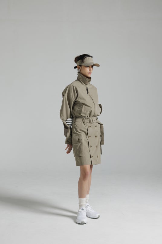 伸縮性や吸水速乾などの基本的なスポーツウェアの機能性と、街着としても使いたくなるデザインが融合したミニマルなスタイルのコレクションです。夏でも涼しく快適に着用できるシアサッカー素材のオープンカラーシャツやショートパンツ、機能性素材でアップデートした持ち運びがしやすいスウィングトップに加え、トレンチコートを彷彿とさせるスカートがラインナップ。