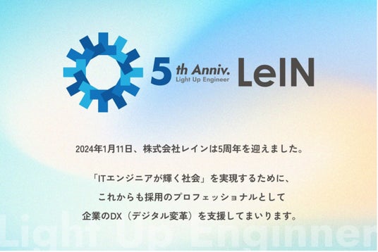 2024年1月11日、株式会社レインは創業5周年を迎えました。「ITエンジニアが輝く社会をつくる」というビジョンを実現するために、これからも採用のプロフェッショナルとして企業のDX(デジタル変革)を支援してまいります。日頃の感謝を込めて、このたび特設サイトを公開しました。