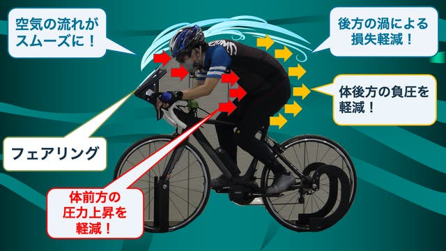 この中で「前面と背面の圧力差」によるで抵抗が最も大きな要素となります。自転車にフェアリングを装着することで空気の流れがスムーズになり、走行中の「前面と背面の圧力差」が小さくなるため、抵抗が軽減し向かい風でも少し楽に走行することができます。