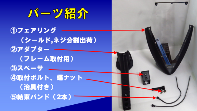 数値流体解析および風洞実験により、軽量かつコンパクトでも空気抵抗軽減効果が得られるようデザインされています。本体および取付材一式の重量は400gで、ハンドル幅よりも小さく、取付時にフェアリングの先端は前輪よりも前に出ません。