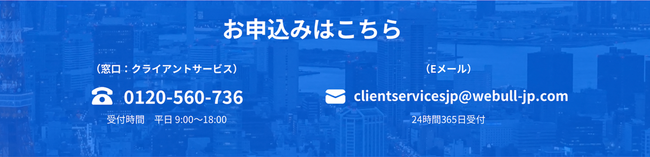 法人口座開設のお申込みは、弊社クライアントサービスまでお電話(0120-560-736)、もしくはメール(clientservicesjp@webull-jp.com)にてお問合せください。