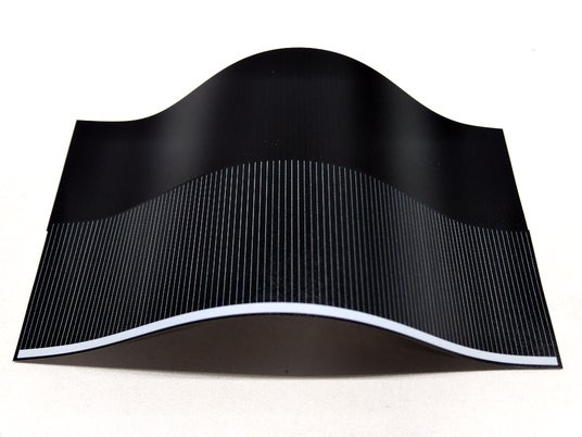 標準セルでは、黒い太陽電池の表面に白い櫛状電極が形成されているため、やや意匠性が劣っていましたが、新技術により漆黒の高意匠セルが実現しました。これにより車のルーフとの一体感が増し、車のデザインを損なわずに「曲がる太陽電池」を搭載できるようになりました。