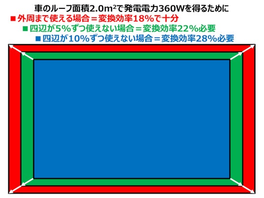 柔軟で自由に貼り合わせできる「曲がる太陽電池」が実現したことで、車のルーフの曲率が比較的大きな、外周領域まで搭載が可能となりました。そのおかげで、変換効率18%前後でも、十分な発電量を確保できるようになりました。