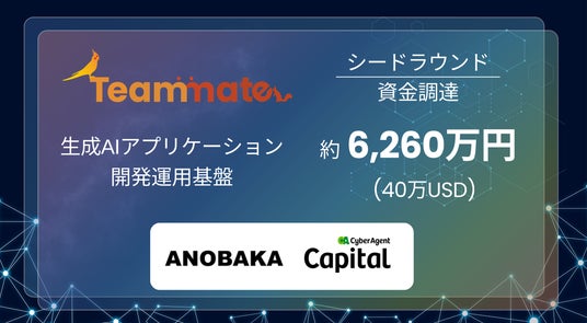Teammate Pte. Ltd.(本社:シンガポール、CEO:大塚 智哉)は、ANOBAKAおよびサイバーエージェント・キャピタルが共同で主導するシードラウンドにて400,000USD(約6,260万円※)の資金調達を実施したことをお知らせします。これにより、生成AIを自社製品や業務プロセスに迅速・安全に組み込み、継続的な精度向上を可能にするエンジニア向けツール『Teammate AI Services』のさらなる開発とグローバル展開を加速してまいります。