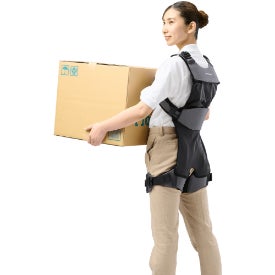 ゴムを利用した電力を使用しないアシストスーツ。背中のゴムバンドと幅の広いパッドで肩と脚、臀部をしっかりホールドすることで前傾姿勢を安定させ、前傾姿勢の作業時、重量物の上げ下げの作業時に腰の負担を軽減できます。脱着、調整方法も簡単なため、様々な作業で使用可能。