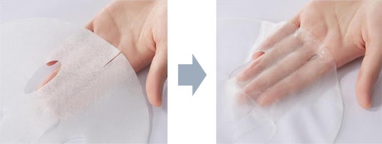 2. 十分に水分を含んだマスクを取り出して広げ、最初に目の位置、次に口の位置にマスクを合わせてから顔全体に密着させます。