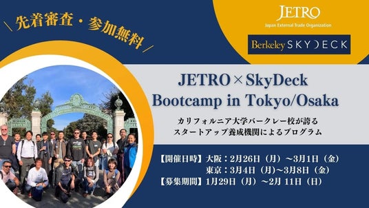 ジェトロでは、米カリフォルニア大学バークレー校発、世界有数のファンドを持つアクセラレーターBerkeley SkyDeckのメンター・アドバイザー陣が来日して実施するブートキャンプを大阪・東京の2会場で開催します。研究アイデアから事業化・起業を目指す研究者や海外展開を目指すスタートアップの方々を対象にした、短期集中型夜間対面プログラムの参加者を募集します。日中に授業や研究・仕事等に追われる研究者、ビジネスマンの方々でも参加が可能です。アイデアをビジネス化し、米国での事業展開を進める際の秘訣を学ぶワークショップやご相談、ネットワーキングの機会を提供します。