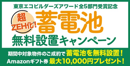 蓄電池を無料設置することで、光熱費を抑え、また災害時でも安心して暮らしてもらいたいという思いから、キャンペーン期間中に対象物件のいずれかをご成約いただいた方に、250万円相当の蓄電池を無料でプレゼント(工事費込み)。また期間中に対象物件の見学をご予約いただいた方には、Amazonギフト券を最大10,000円分プレゼントいたします。