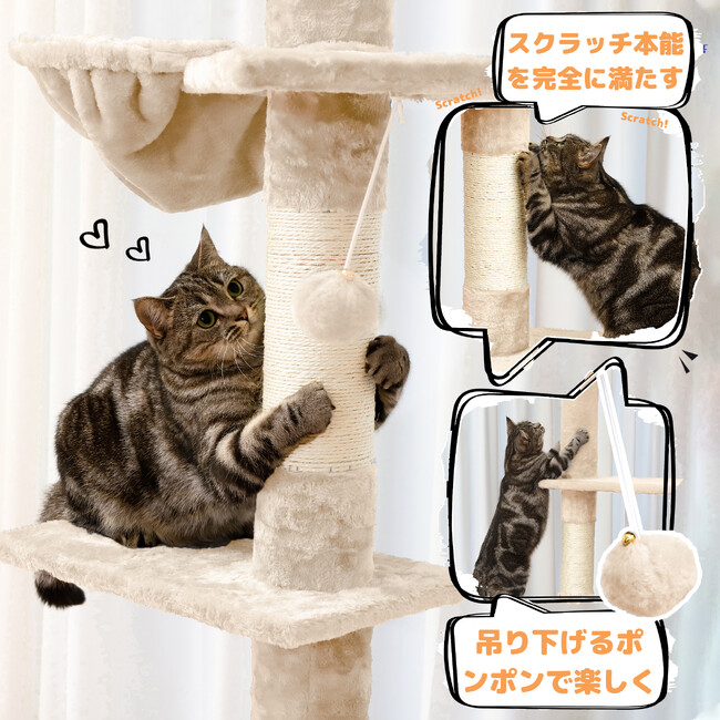 5.趣味: 伝統的な一柱式キャットツリーとは異なり、私たちのデザインは猫の楽しみを重視しています。ユニークな構造には猫ベッド、ブランコ、高台などが含まれ、猫の遊び心と探求心を引き出します。