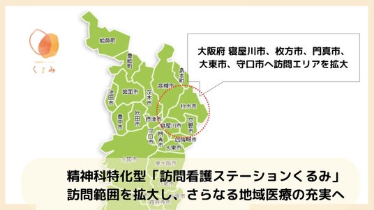 この度、地域医療のニーズの高まりを受け、これまでの大阪市に加え、新たに寝屋川市、枚方市、門真市、大東市、守口市まで訪問範囲を拡大いたしました。これにより、より多くの方々に適切な訪問看護サービスを提供し、地域に根差した包括的な支援を強化してまいります。