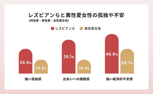 「あなたは孤独であると感じることがありますか?」という質問に「しばしば・常にある」と回答した割合が、異性愛女性は14.3%であるのに対し、レズビアン、バイセクシュアル、パンセクシュアルの女性は25.5%と1.8倍になりました。