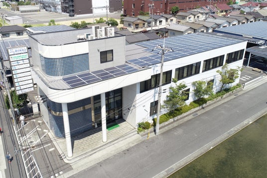 コワーキングスペース「ひとやね」外観(空撮):地域に開かれた“場”として設計された、植田板金店の新たな拠点。