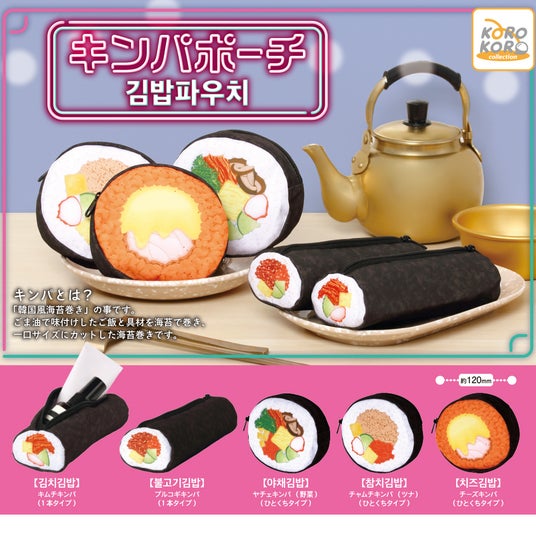 本商品は、大人気の韓国風海苔巻き「キンパ」をモチーフにしたポーチです。形状は普段使いに最適な2パターンで展開。1本タイプの「キムチキンパ」「プルコギキンパ」は、筒状でペンケースにも使えます。ひとくちタイプの「ヤチェキンパ(野菜)」「チャムチキンパ(ツナ)」「チーズキンパ」は、マチ付きで小物の収納に便利です。