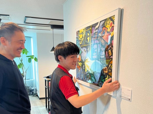 ジグレー版画による高精細印刷で、障がいのある人のアートを3ヶ月1種×計4種/年にてオフィス内に掲示いたします。アートの設置、交換は一般社団法人FUKU・WARAIが運営する就労継続支援B型事業所「アトリエにっと」の障がいのあるアーティストたちが担っています。