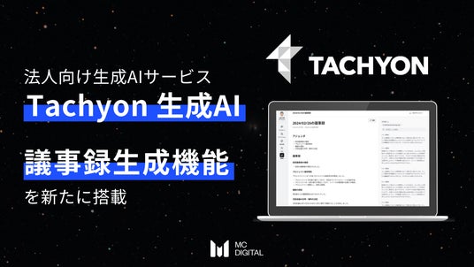 エムシーデジタル株式会社(本社:東京都千代田区、代表取締役社長:河内 伸学)は、同社が開発を進める法人向け生成AIサービス「Tachyon 生成AI」において、音声・動画の入力から会議における発言の文字起こしと議事録を自動生成する新機能を搭載しました。本機能により、日々の議事録作成かかる時間と労力を大幅に削減することが可能になります。