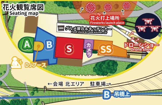 当日は、DJによる音楽演出や夜店市としてキッチンカーや屋台が立ち並び、一足早い夏祭り気分を味わえるほか、みなさまに快適にゆったりと花火とドローンショーをお楽しみいただけるよう観覧席を用意してお待ちしています。