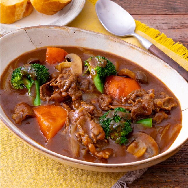 詳細 長く煮込まなくてもいい牛こま肉を使ったビーフシチュー!ごろっと入れたにんじんとブロッコリーが鮮やか。食感も楽しめます。