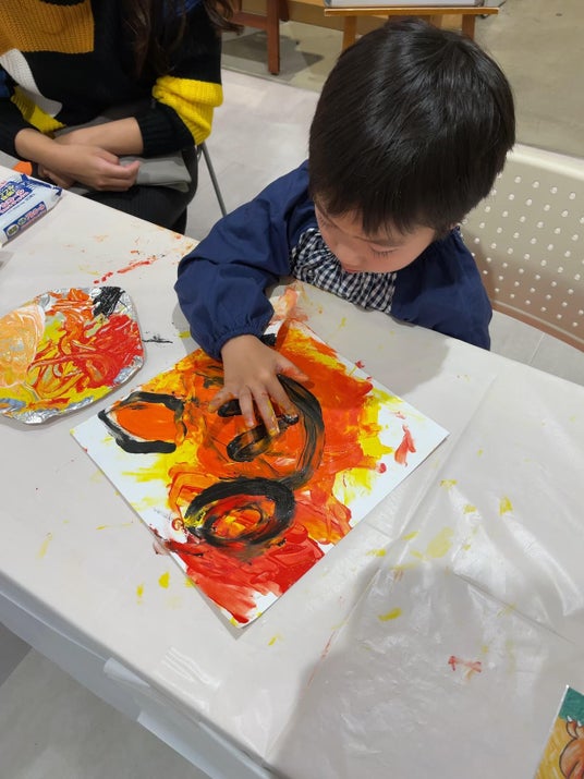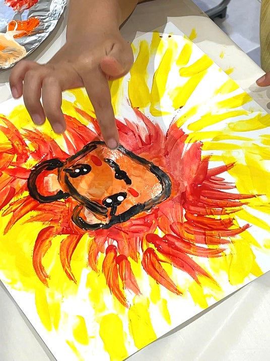 最初は緊張しながら絵の具に触れる子どもたち、徐々に力強く、元気で十人十色の「らいおんサン」が完成します。「指でらいおんサンを描こう!」