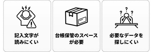 - 検索性の低さ: 警察の立ち入りや過去の取引照会時、該当書類を探し出す膨大な時間。
