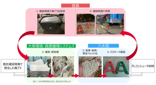 大栄環境グループの大栄環境株式会社と資源循環システムズ株式会社は、鹿島建設株式会社、株式会社八木熊、と共同で建設現場から排出された廃プラスチックを再資源化して工事用バリケードを製造できることを実証し、実際の建設現場に導入しました。