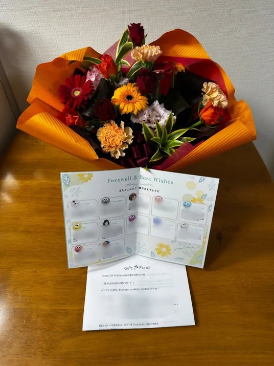 "時間が無くても、皆で応援メッセージを贈れた"同僚が転職した際、オフィスの皆からギフトファンドを贈りました。(荷物になってもたいへんかと思い、住所を聞いて、そちらに届くように)動き出しが遅く日が無かったのですが、企画して数名に声をかけたら、色々な人に広まり、無事に成立しました。皆で応援のメッセージを贈ることができ、同僚もとても喜んでくれました。