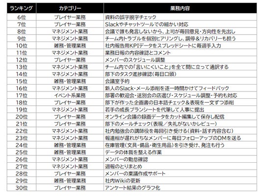 - 調査では「上司がやるべきでない業務」を自由回答・選択形式で収集し、内容をカテゴリ分類・件数順に100位までランキング化。