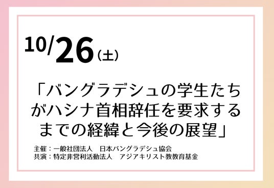「バングラデシュの学生たちがハシナ首相辞任を要求するまでの経緯と今後の展望」と題して、認定NPO法人アジアキリスト教教育基金(ACEF)共演、日本バングラデシュ協会主催の講演会が開催されます。