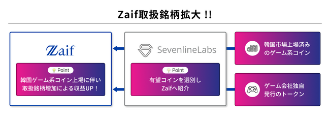 本提携により、「Zaif」は、韓国のゲーム市場に精通するSevenlineLabs を通じて、韓国の有力ゲームタイトルコインの紹介を受け、Zaif に上場することで収益アップを図ります。
