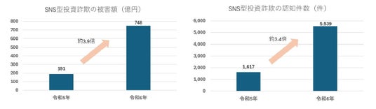 ※警視庁『令和6年10月末におけるSNS型投資・ロマンス詐欺の認知・検挙状況等について』よりフィナップが作成。令和5年、令和6年ともに1月~10月の期間で集計