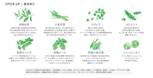 9種類のグリーンをベースに、乳酸菌やシャンピニオンエキス、プレバイオティクスとしても知られているフラクトオリゴ糖をブレンド。羅漢果でほのかな甘みをプラスしています。葉緑素、食物繊維、ビタミンB 群やβカロテン、鉄や亜鉛などのミネラル類をバランスよく含んでいます。すこやかな胃腸を目指し、体全体のバランスをサポート。程よい甘さで飲みやすく、続けやすいブレンドです。