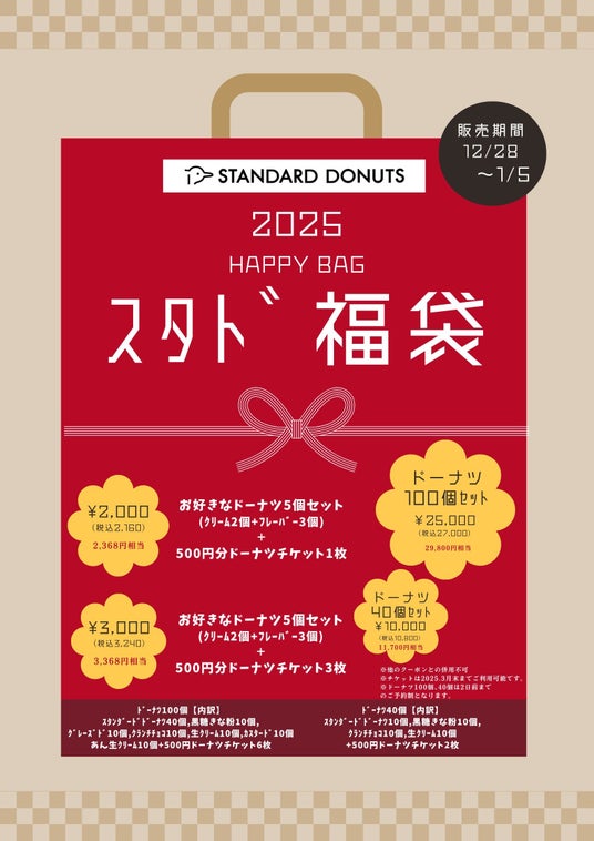 オープン1ヶ月で当初予定を上回る約23,000個のドーナツを販売。こちらを運営する株式会社温度(大阪市福島区、代表者 宮武訓)が、2025年の新年を祝して、特別な福袋を販売致します。お好きなドーナツをお選びいただける福袋や、大人数で楽しめる40個、100個セットの福袋など、幅広いラインアップをご用意しました。年末年始のお手土産やご家族、ご友人との集まりに最適なアイテムです。