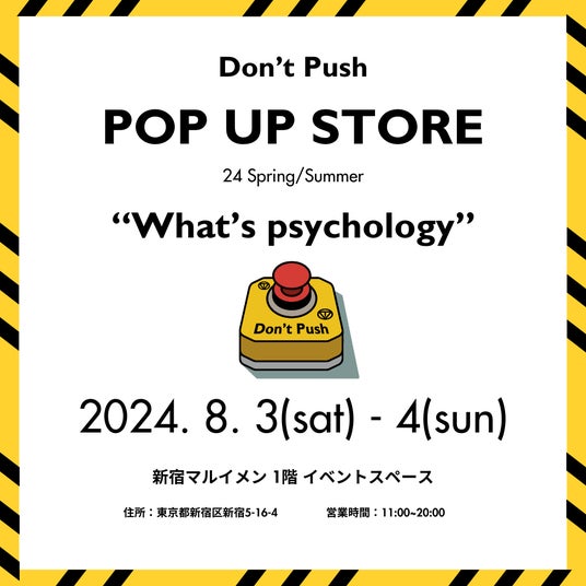心理学×ファッションをテーマにロサンゼルスと東京を拠点に北アメリカとアジアを中心に展開しているストリートブランド「Don't Push(ドントプッシュ)」は、2024年8月3日(土)~8月4日(日)の期間、新宿マルイメンにて日本初となるポップアップストアを開催します。