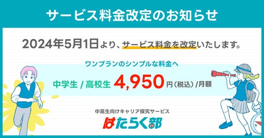株式会社RePlayceが運営する中高生向けキャリア探究サービス「はたらく部」は、2024年5月1日より中学生コース・高校生コースの料金プランを改定し、4,950円(税込み)に統一することをお知らせいたします。