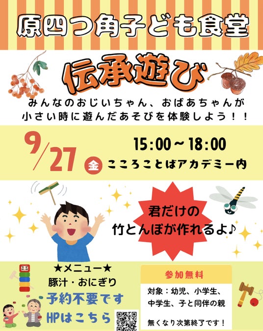 2024年9月は「伝承遊び」をテーマに、現代の子ども達が体験したことが少ない昔ながらの遊びを体験できる「体験型こども食堂」を実施します!竹とんぼ、だるま落とし、おてだま、けん玉など、遊びを通して昔にタイムスリップできる時間にしたいと思います。