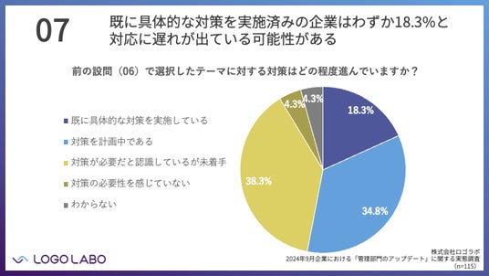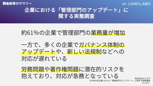企業のブランディング・マーケティングをDX・ITで支援する株式会社ロゴラボ(東京都中央区、代表取締役社長:野崎 智裕、以下 当社)は、コーポレートガバナンス実態調査として『企業における「管理部門のアップデート」に関する実態調査』を2024年9月18日に公開したことをお知らせいたします。本調査は、企業の管理部門に所属する従業員・経営層を対象に行い、多くの企業が管理体制のアップデートに遅れをとっている現状が明らかになりました。特に、著作権関連や労務問題が潜在的な大きなリスクとして認識されています。